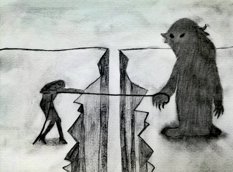 Ik heb eens een gesprek met iemand gehad en tijdens dit gesprek liet diegene mij iets zien. Ik heb dit geprobeerd te illustreren ter verduidelijking. Diegene liet mij een beeld zien. Het beeld van een kloof. Aan de ene kant sta ik. Aan de andere kant mijn monster. Het enige wat ons verbindt is een touw. Beide houden we dit touw vast. Beide trekken we aan het touw. Ik trek met al mijn kracht, hopend dat ik dat monster voor eens en altijd de afgrond in zal trekken. Of trek ik omdat ik zo vreselijk bang ben dat ik degene zal zijn die in de afgrond stort?